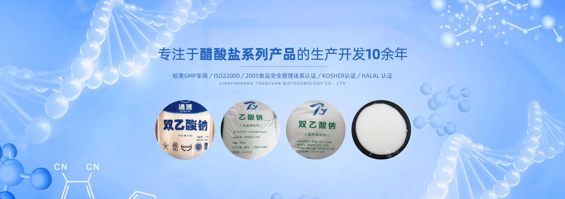 連云港市通源生物科技有限公司 是生產雙乙酸鈉、無水醋酸鈉、三水醋酸鈉、醋酸鉀、乙酸鈉、丙酸鈉、丙酸鈣和氯化鉀等系類醋酸鹽產品的專業制造商。公司專注于醋酸鹽系列產品的生產開發(fā)10余年,是國內專業醋酸酸鹽產品生產基地。 目前,我們已和全球30多個國家和地區建立長期的業務合作關系,是中國較大的雙乙酸鈉生產商和出口商之一。作為中國食品添加劑和配料協會理事單位,通源公司已建成標準GMP車間5000余平方米,通過了ISO22000:2005食品安全管理體系認證、KOSHER認證、HALAL 認證等,這些都是我們提供高質量產品和優(yōu)良服務的前提和確保。 生產出色產品,提供優(yōu)良服務,滿足顧客需要,是我們努力的目標。愿和我們的朋友們攜手,共...